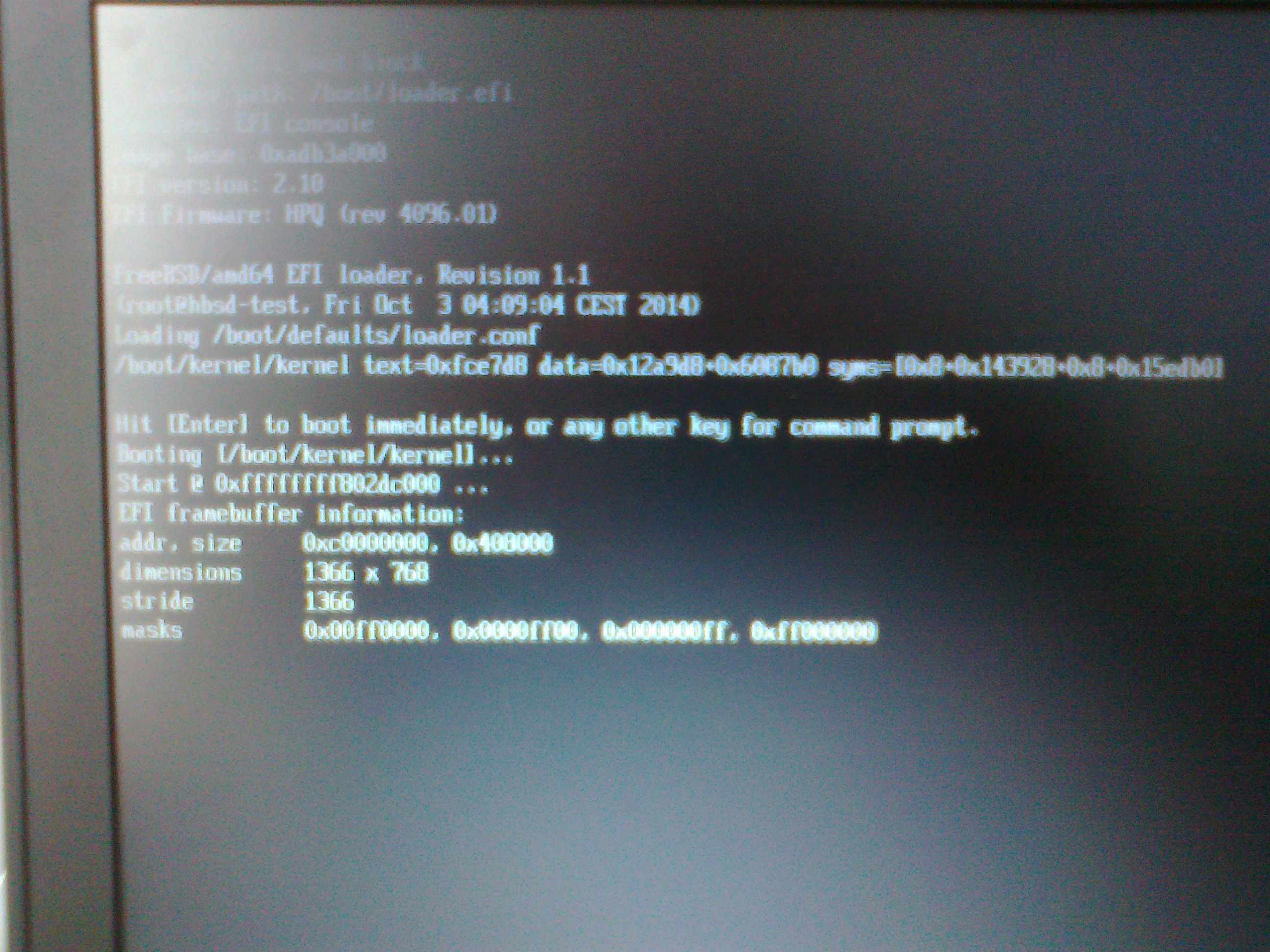 In the mean time have I had the pleasure of continuing my UEFI experiments at home using VirtualBox and FreeBSD/amd64 stable/10 r279507. The VT console runs pretty fast and gives us a console geometry of 128×48 when VirtualBox gives the VM a graphical geometry of 1024×768. Compare that to the traditional 80×25 console geometry.